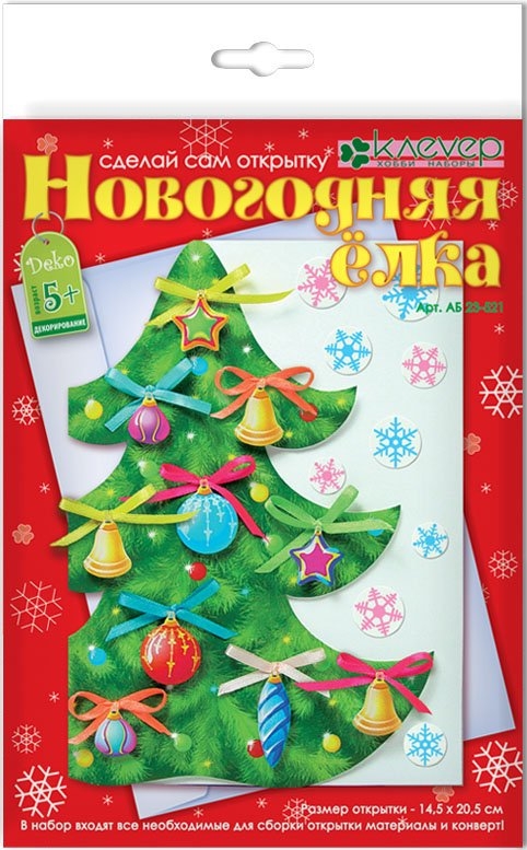 - В наборе: бумага, ленты, открытка-ёлка, конверт, двусторонний скотч, инструкция