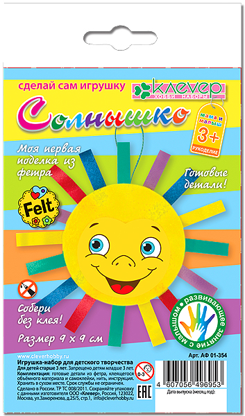 Задорное солнышко с разноцветными лучиками – игрушка-подвеска из фетра для ребёнка старше 3х лет. Мама поможет малышу нарезать и приклеить ленточки-лучики на клейкую объёмную основу, приклеить нить-подвеску, круг из жёлтого фетра и весёлую мордочку-самоклейку. Набор помогает ребёнку запомнить названия цветов, развивает мелкую моторику, тактильность, усидчивость и аккуратность. Ножницы и клей не понадобятся. Яркая игрушка-подвеска станет отличным подарком для мамы и бабушки, украсит детскую комнату и новогоднюю ёлку!