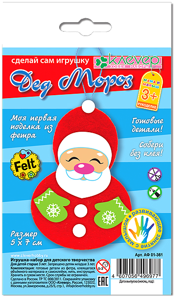 Добрый Дедушка Мороз в нарядных рукавицах – игрушка-подвеска из фетра для ребёнка старше 3х лет. Мама поможет малышу склеить два овала клейкой объемной основы, приклеить нить-подвеску, готовые детали из фетра и самоклейки. Набор помогает ребёнку запомнить названия цветов, развивает мелкую моторику, тактильность, усидчивость и аккуратность. Ножницы и клей не понадобятся. Яркая игрушка-подвеска станет отличным подарком для мамы и бабушки, украсит детскую комнату и новогоднюю ёлку!