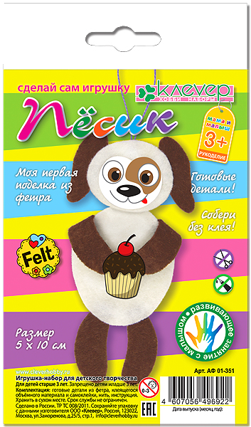 Смешной Пёсик со сладкой пироженкой в лапках – игрушка-подвеска из фетра для ребёнка старше 3х лет. Мама поможет малышу склеить два овала клейкой объемной основы, приклеить нить-подвеску, готовые детали из фетра и самоклейки. Набор помогает ребёнку запомнить названия цветов, развивает мелкую моторику, тактильность, усидчивость и аккуратность. Ножницы и клей не понадобятся. Яркая игрушка-подвеска станет отличным подарком для мамы и бабушки, украсит детскую комнату и новогоднюю ёлку!