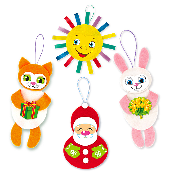Лучистое солнышко, милый зайка с букетиком, забавный Котя и Дедушка Мороз – 4 веселые игрушки из фетра понравятся ребёнку старше 3х лет. Мама поможет малышу приклеить на клейкую объемную основу нить-подвеску, разноцветные ленточки, готовые детали из фетра и самоклейки. Набор помогает ребёнку запомнить названия цветов, развивает мелкую моторику, тактильность, усидчивость и аккуратность. Ножницы и клей не понадобятся. Яркие игрушки-подвески станут отличным подарком для мамы и бабушки, украсят детскую комнату и новогоднюю ёлку!