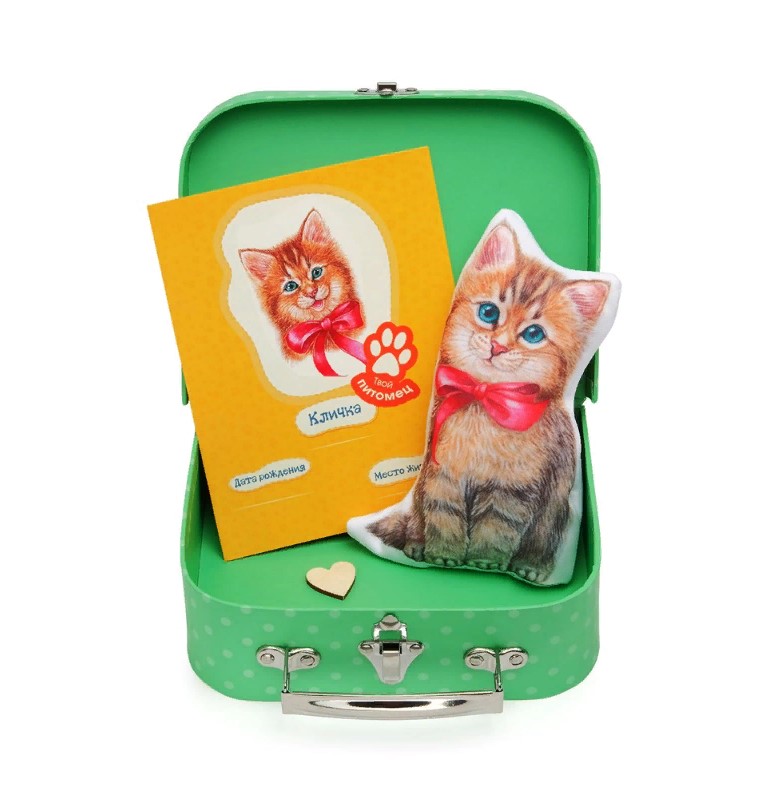 - В комплекте: выкройка для игрушки, наполнитель, паспорт питомца, деревянное сердечко, чемодан