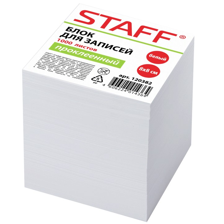 Блок для записей 1000 листов, Staff, проклеенный, куб 80*80 мм 120382