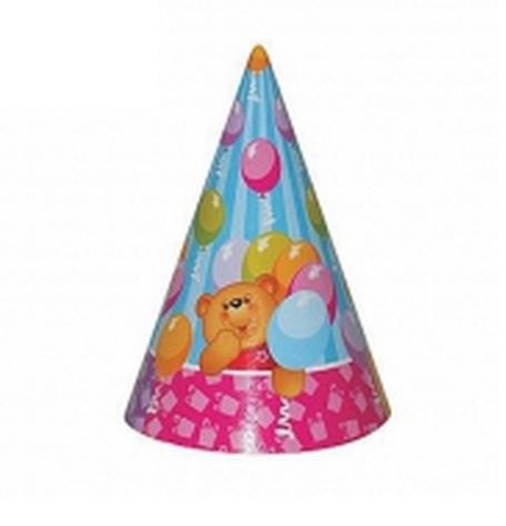 Стильный колпак с изображением веселого мишки придется по душе и девочкам, и мальчикам. Аксессуар выглядит модно. Изготовлен из плотного картона, который выдерживает все детские шалости. Надежно крепится на голове ребенка с помощью резинки. На лицевой стороне колпака «Медвежонок» нарисован коричневый мишка в окружении разноцветных воздушных шариков. В тематической серии, кроме колпаков, есть скатерти, салфетки и одноразовая посуда. В комплекте шесть колпаков для именинницы и ее гостей.