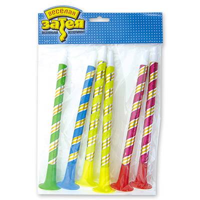 Чтобы детский праздник, утренник и пикник прошел весело и незабываемо, позаботьтесь о программе конкурсов и игр. Если в ней найдется место для музыкальных состязаний, купите пару комплектов нашей разноцветной дудочки. Музыкальные инструменты изготовлены из прочной пластмассы, разукрашены в яркие жизнеутверждающие оттенки. При надувании издают забавные звуки, имитирующие классические музыкальные инструменты. В комплекте предусмотрено по шесть экземпляров, чтобы каждый ребенок получил свою игрушку.