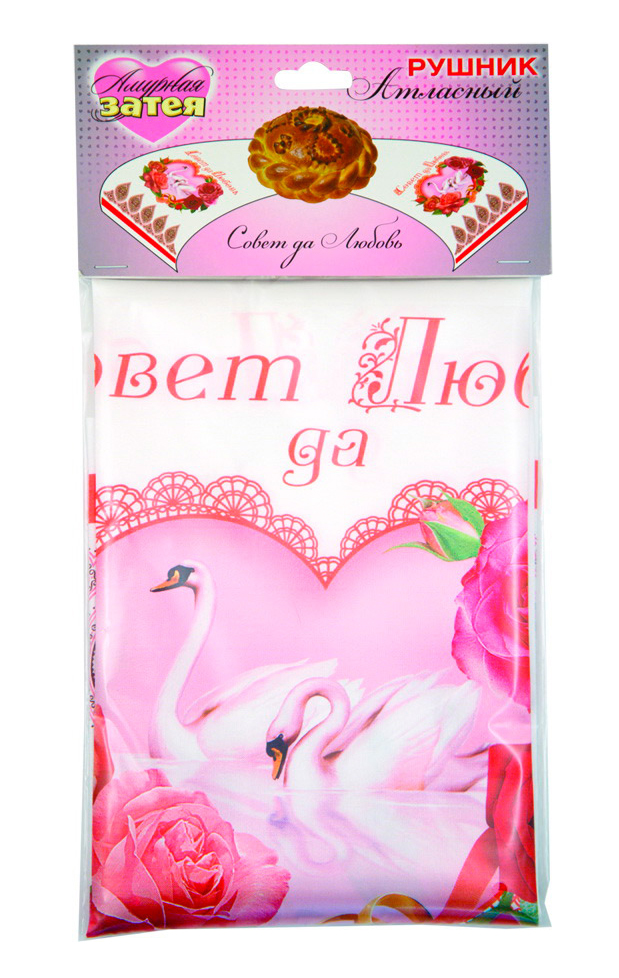 Свадебный рушник "Совет да Любовь" выполнен из ткани с атласным нанесением. По краям рушник украшен лебедями и розами. По традиции на нем не только можно подать хлеб-соль, но и поднять его над головами новобрачных, образовав арку для входа в зал. Длина рушника: 140 см, ширина: 35 см.