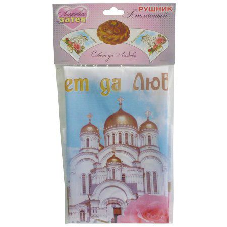 Свадебный рушник "Совет да Любовь" выполнен из ткани с атласным нанесением. По краям рушник украшен лебедями и розами. По традиции на нем не только можно подать хлеб-соль, но и поднять его над головами новобрачных, образовав арку для входа в зал. Длина рушника: 140 см, ширина: 35 см.