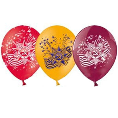 Высококачественный шар из натурального латекса. Ассорти из 10-12 цветов (в случайном соотношении), одного типа - пастель - матовый оттенок цвета. Шары с двусторонним шелкографическим рисунком на тему "День Победы", "9 Мая", "Орден Отечественной Войны" в пакете) с большим полем печати. Идеальный ассортимент для розничной продажи воздушных шариков и украшения праздника.