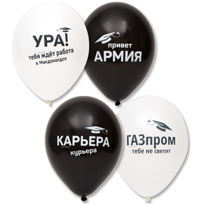 Воздушные шары для выпускников с шуточными надписями. Размер шарика в надутом состоянии 30 см. Поставляется упаковками, внутри которых 25 шариков черного и белого цвета. Надписи: Ура! Тебя ждет работа в Макдоналдсе! Привет Армия! Карьера Курьера. Газпром тебе не светит. Купить шары с шуточными оскорблениями - отличный способ поприкалываться над знакомыми и друзьями, а также удивить их нестандартным поздравлением!