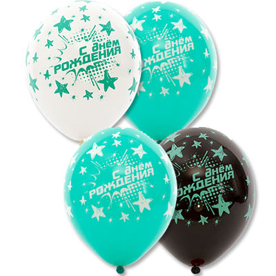 Высококачественный шар из натурального латекса. Одного типа - пастель. Шары с пятисторонним - круговая печать, шелкографическим рисунком С Днем Рождения. Звезды бирюзовые. Предназначен для розничной продажи воздушных шариков. Ассортимент шаров ярких цветов.