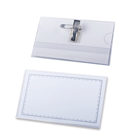 Горизонтальный жесткий бейдж для именной карточки. Закрепляется на одежде при помощи клипсы или булавки.