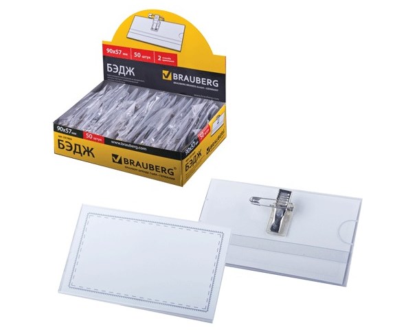 Бейдж 90*57 мм, горизонтальный BRAUBERG комплект 50 штук, жесткий, с клипсой и булавкой