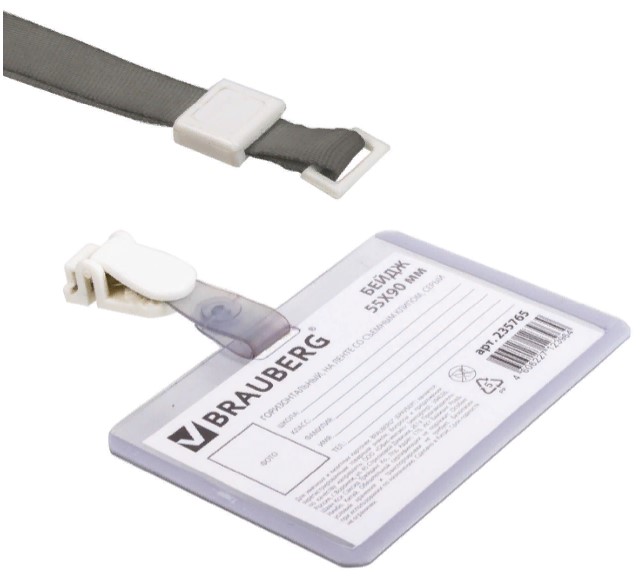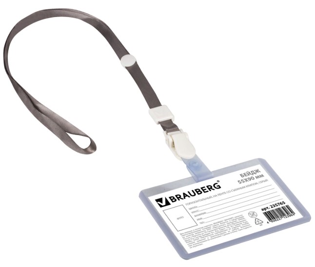 Бейдж школьника BRAUBERG 55*90 мм, горизонтальный, на ленте с клипом, серый
