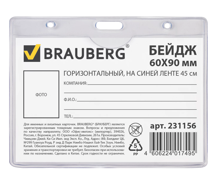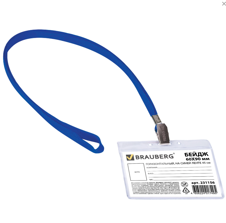 Бейдж BRAUBERG, 60*90 мм, горизонтальный, на синей ленте 45 см, 231156