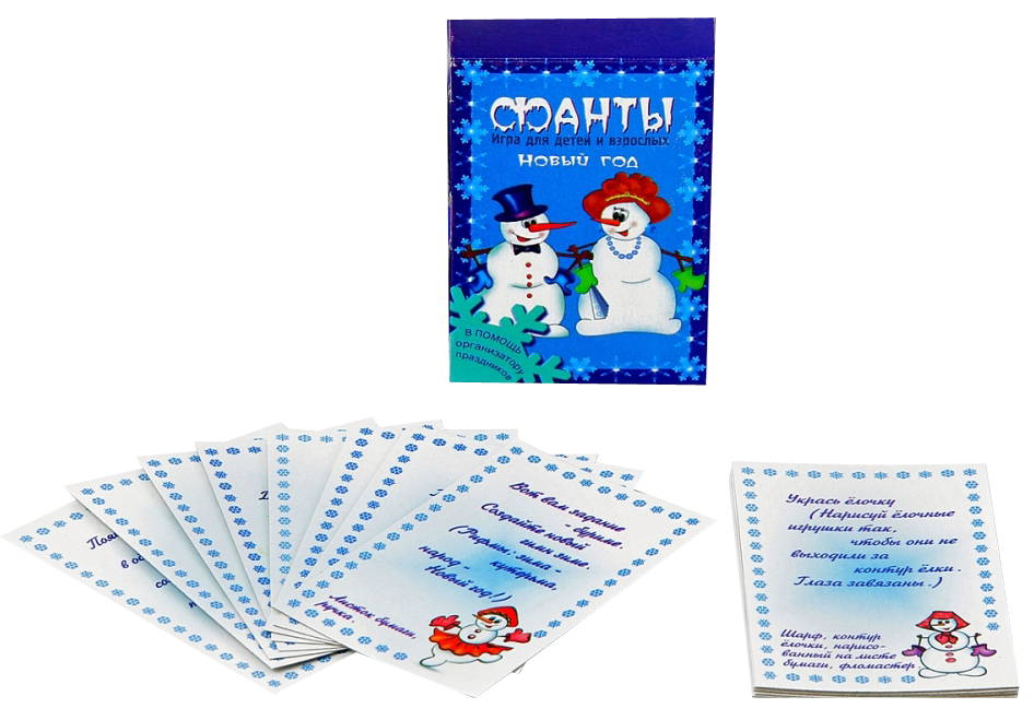 В комплект игры входят 30 карточек с веселыми заданиями, которые помогут в организации празднования Нового года. С равным успехом игру можно использовать семейном торжестве или на корпоративной вечеринке. К имеющимся в игре заданиям Вы можете добавить свои. Фантазируйте, и Ваш праздник станет незабываемым.