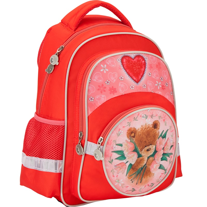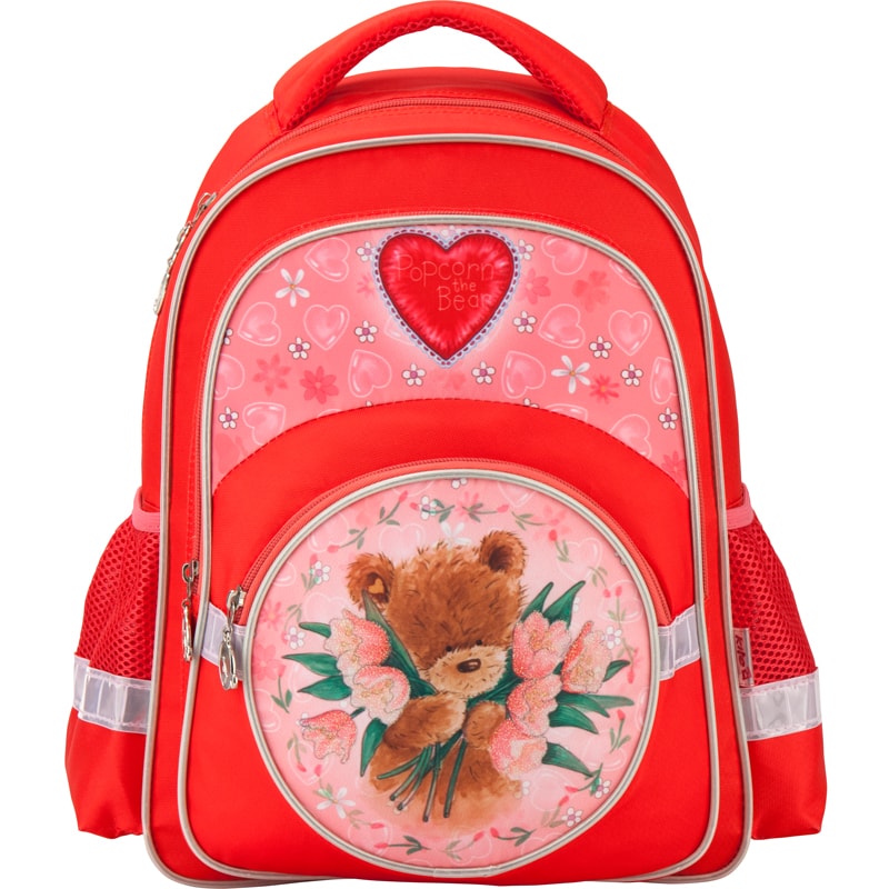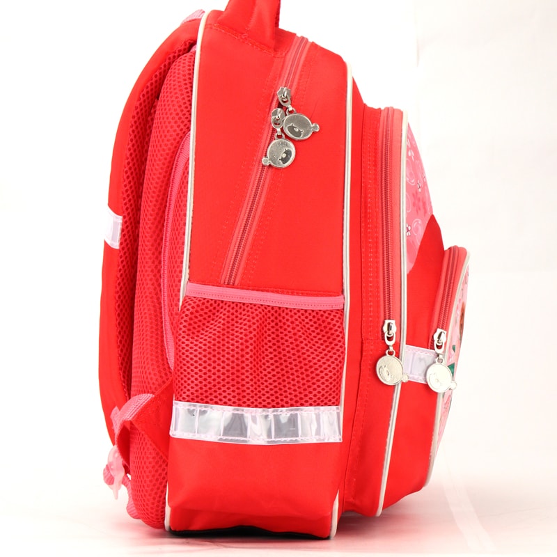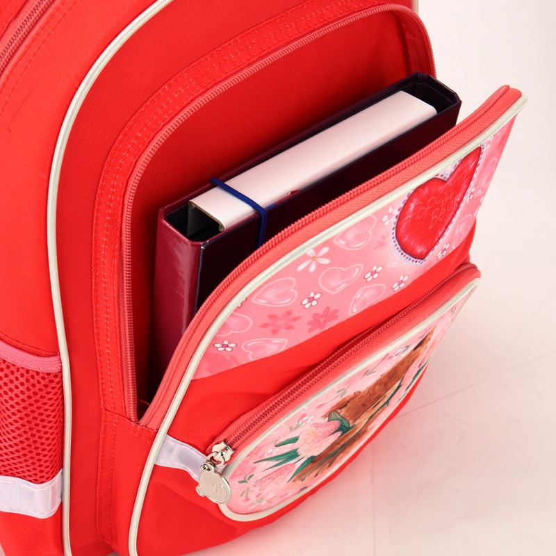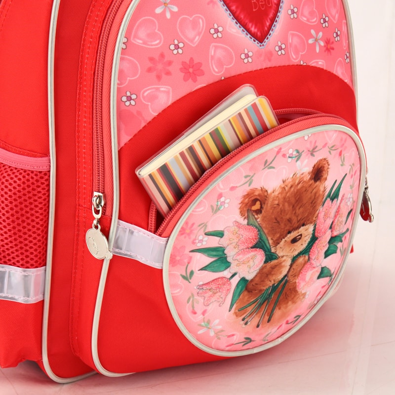 Рюкзак для девочек младшей школы выполнен из прочного полиэстера розового и красного цвета с изображением мишки.