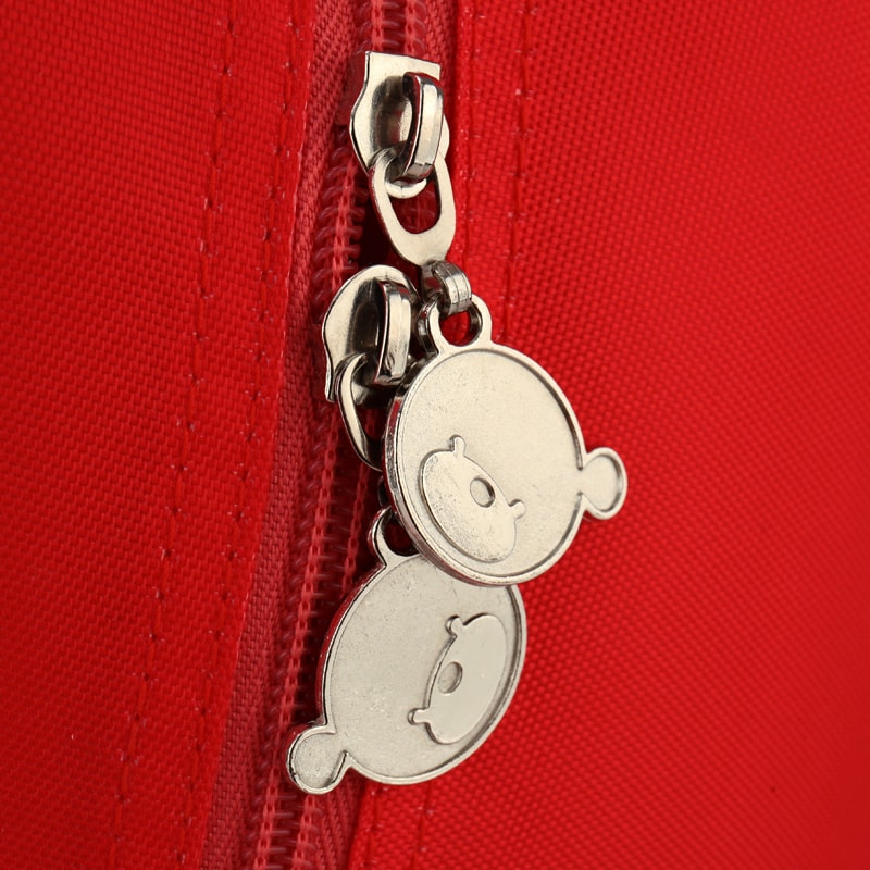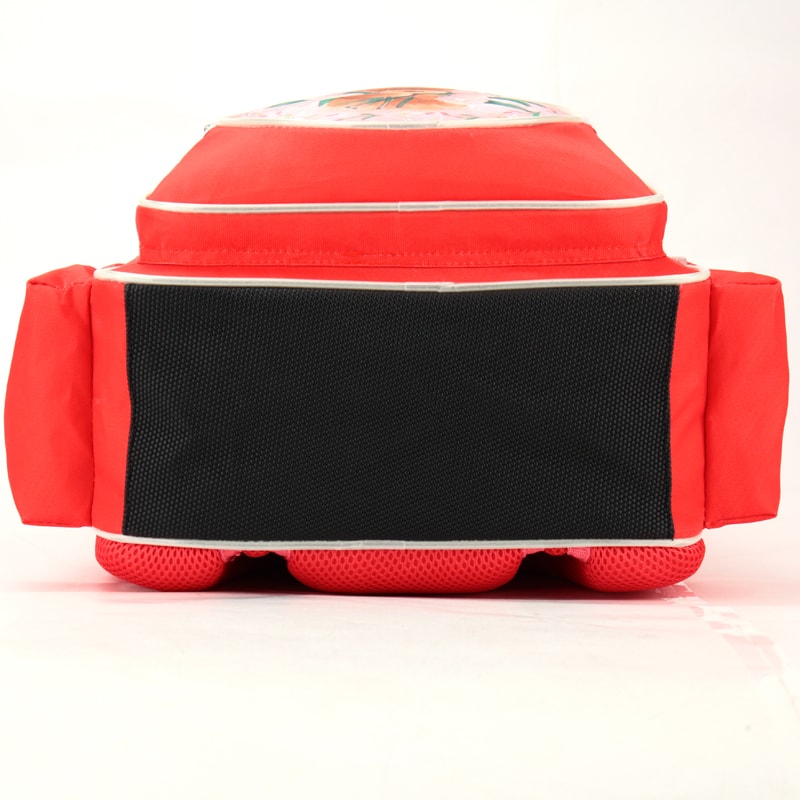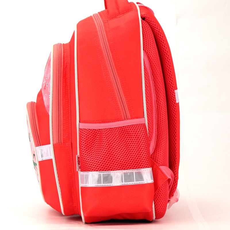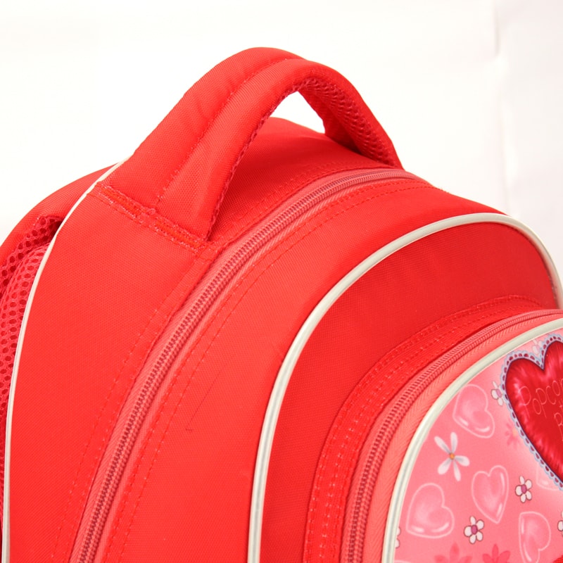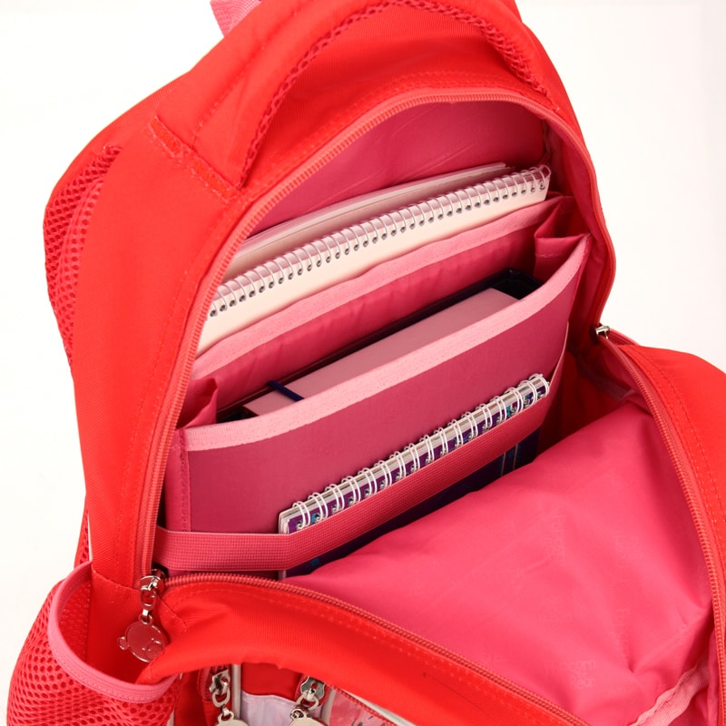 Рюкзак для девочек младшей школы выполнен из прочного полиэстера розового и красного цвета с изображением мишки.