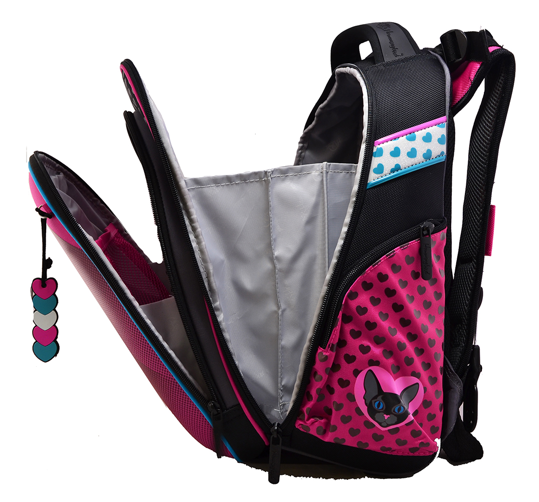- два больших отделения на молниях. В основном, самом большом отделении расположены жесткие перемычки- вставки, для комфортного размещения тетрадей или учебников. В переднем отделении предусмотрен органайзер с карманом для мобильного телефона, сетчатым карманом для мелочей, отделениями для ручек и карандашей, подвеской для ключей;