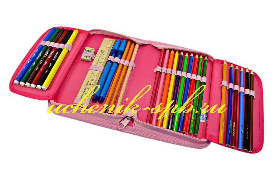 Он достаточно вместительный и в нём может разместиться большое количество разнообразных канцелярских предметов. Внутри пенала есть специальные резиночки-держатели для карандашей, ручек, фломастеров и других пишущих принадлежностей.