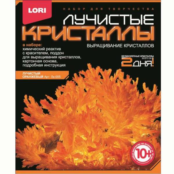 Выращивание кристаллов - самый массовый и самый популярный вид химических опытов для детей. С помощью этого набора можно вырастить крупные кристаллы оранжевого цвета. Суть выращивания - в наблюдении кристаллизации вещества из насыщенного соляного раствора. Позвольте вашему юному ученому сделать свои первые шаги в изучении интереснейшей науки - химии!