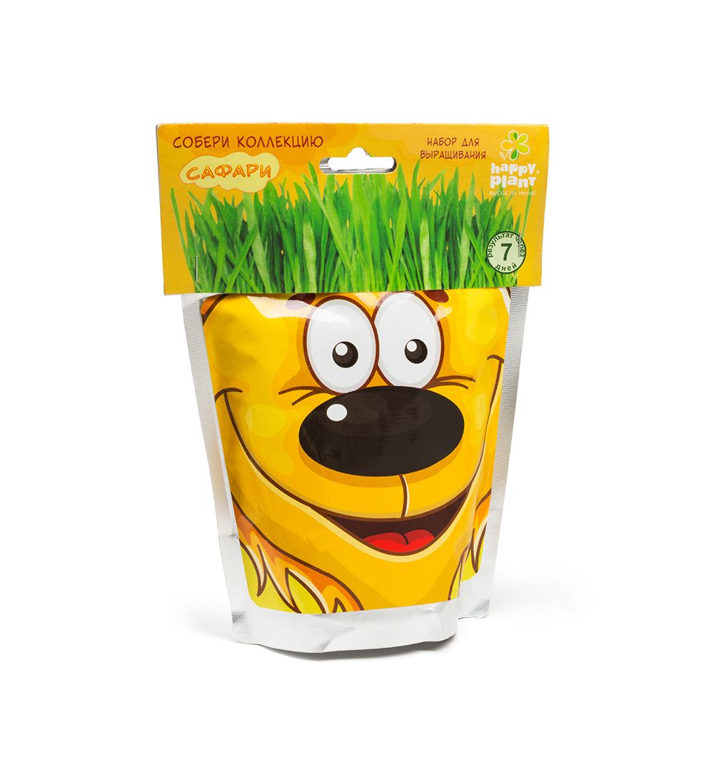 В наборах серии САФАРИ - овес, который вырастает очень быстро, травка получается плотная, густая, зеленая, красивая уже через 3 дня. Детям очень нравится делать прическу своему зеленому питомцу: травку можно подстригать ножницами, создавать разные формы, можно завязывать резинками "хвостики", можно даже заплетать зеленые косички!