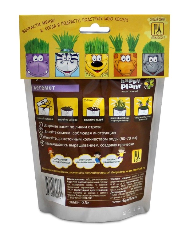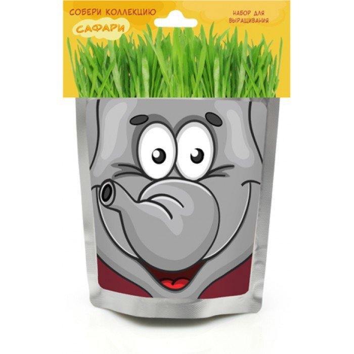В наборах серии САФАРИ - овес, который вырастает очень быстро, травка получается плотная, густая, зеленая, красивая уже через 3 дня. Детям очень нравится делать прическу своему зеленому питомцу: травку можно подстригать ножницами, создавать разные формы, можно завязывать резинками "хвостики", можно даже заплетать зеленые косички!