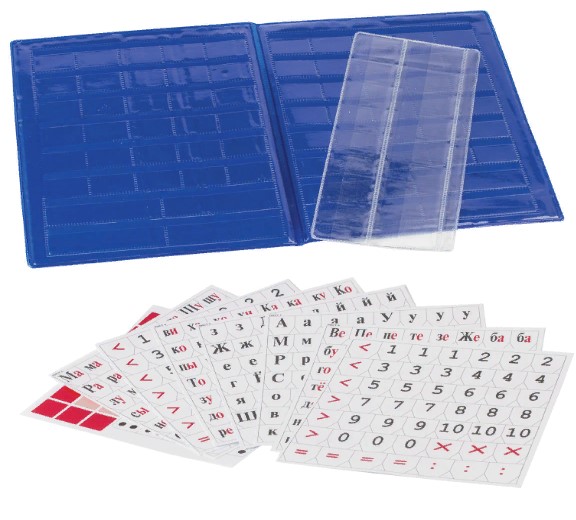 - Раскладная упаковка из ПВХ со специальными прорезями для карточек с буквами и цифрами.