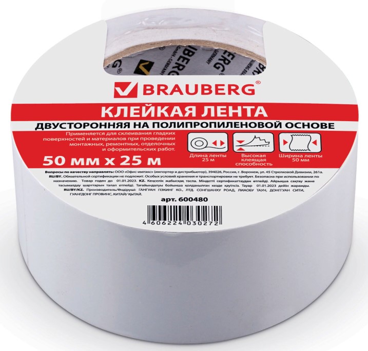 Клейкая лента двухсторонняя 50 мм*25 м BRAUBERG, основа - полипропилен