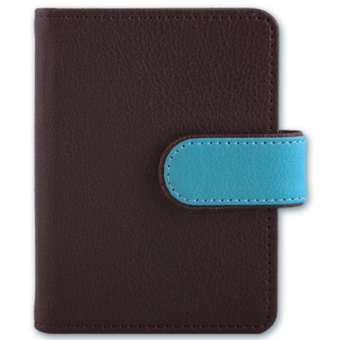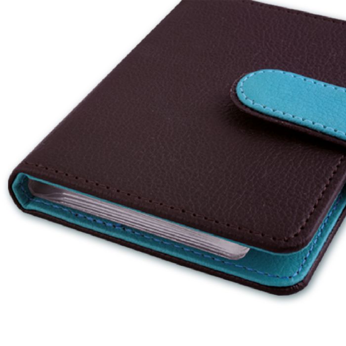 Визитница размера 110*80 мм, имеет 16 односторонних ПВХ-карманов на клепках и скрытую застежку-кнопку.