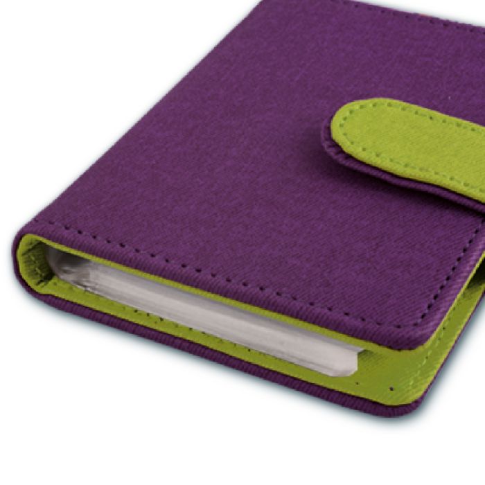 Визитница размера 110*80 мм, имеет 16 односторонних ПВХ-карманов на клепках и скрытую застежку-кнопку.