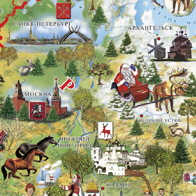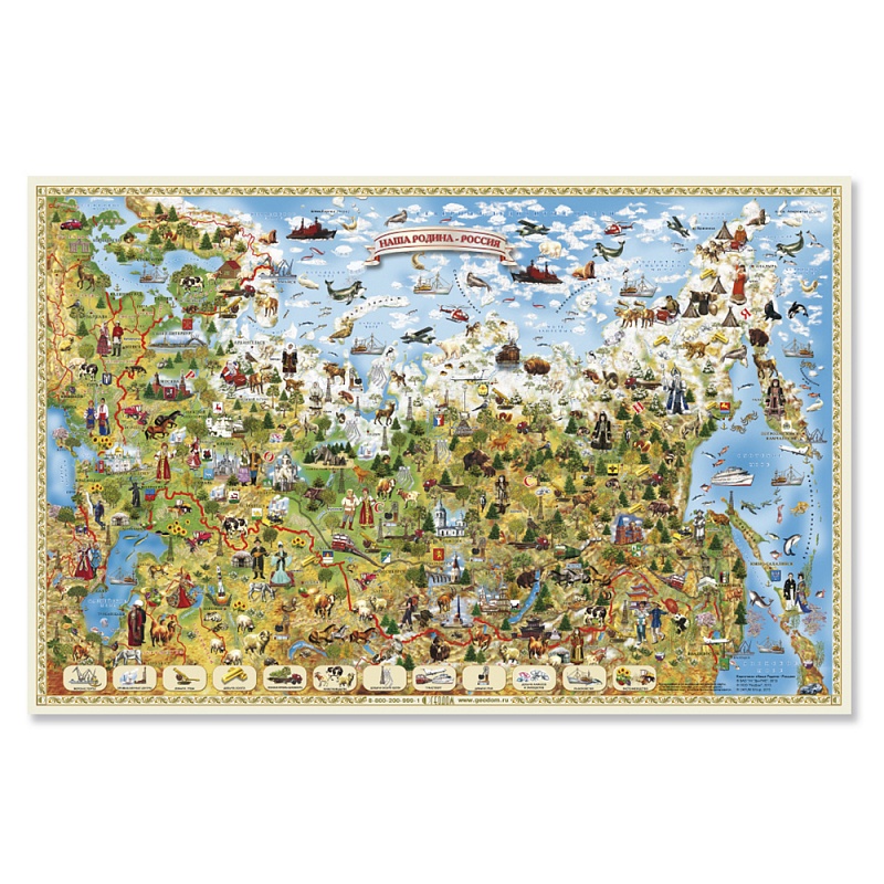 На карте «Наша Родина - Россия» наглядно показано, какие народы её населяют и какое разнообразие животных и растений обитает на территории страны. Также на карте представлены самые интересные места нашей Родины, полезные ископаемые, которыми богата наша земля, виды хозяйственной деятельности, которыми занимается население России, и основные праздники, которые отмечают россияне.