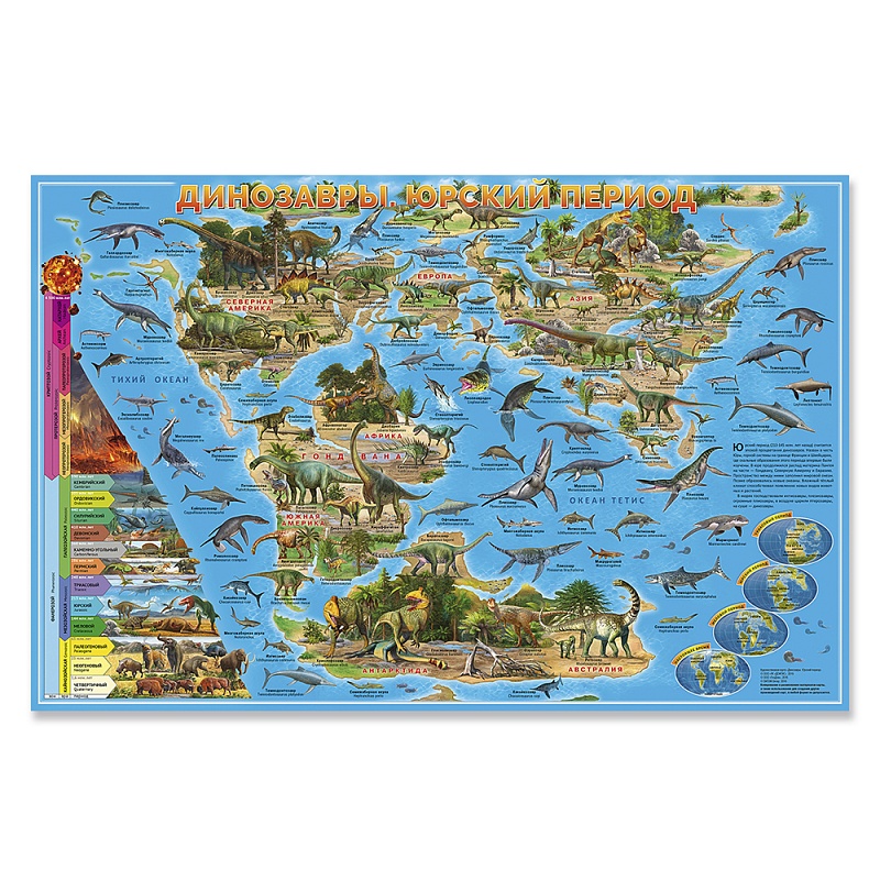 С настольной картой "Динозавры. Юрский период" от издательства "ГЕОДОМ" ребенок сможет познакомиться с динозаврами, которые обитали миллионы лет назад, в эпоху расцвета динозавров - Юрский период. На карте также изображена схема континентального дрейфа и временная шкала истории Земли.