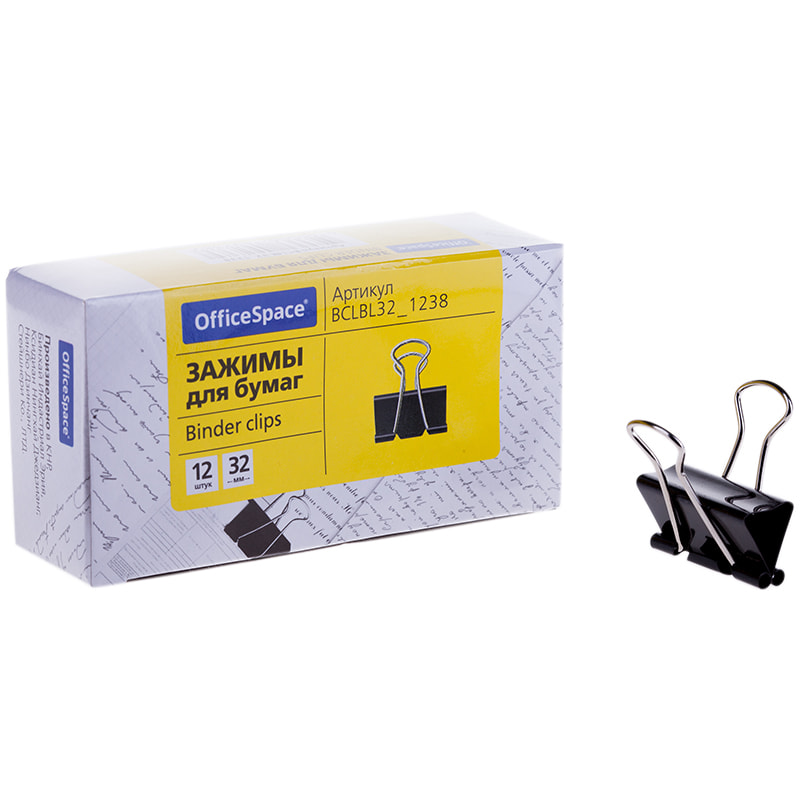 Зажимы для бумаг 32 мм, OfficeSpace, 12 штук, черные, картонная коробка