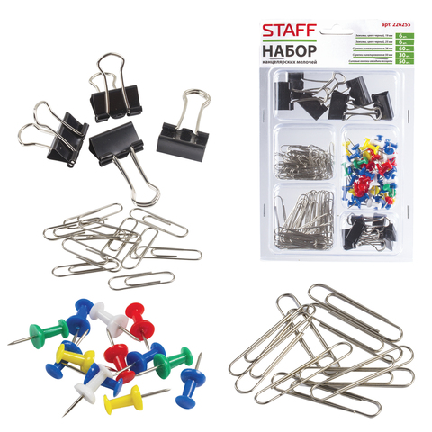 Набор канцелярских мелочей Staff объединяет в себе зажимы, скрепки и кнопки-гвоздики.