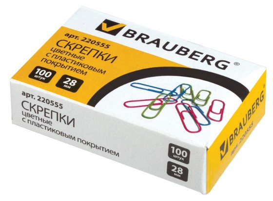 Скрепки 28 мм, цветные Brauberg 100 штук