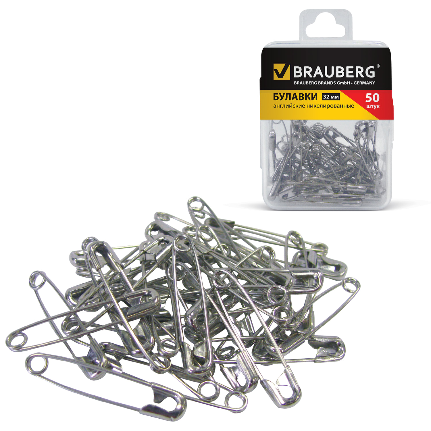 Булавки английские BRAUBERG, 32 мм, никелированные, 50 штук, в пластиковой коробке с европодвесом, 223970
