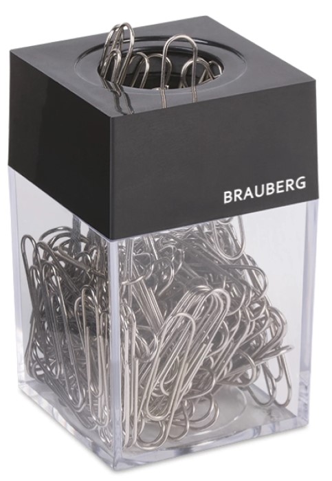 Скрепочница магнитная BRAUBERG с 30 скрепками, прозрачный корпус, черная крышка