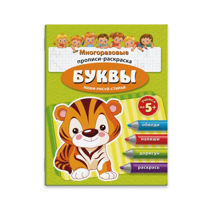 Серия многоразовых прописей-раскрасок «Пиши – рисуй – стирай». Серия включает все необходимые прописи для обучения малыша правильному написанию букв и цифр. С помощью увлекательных упражнений ребёнок потренируется рисовать линии и узоры, научится писать буквы и цифры, разовьёт мелкую моторику рук, координацию движений, внимательность и аккуратность. Серия подходит для первых занятий – следы фломастера легко стираются влажной салфеткой.