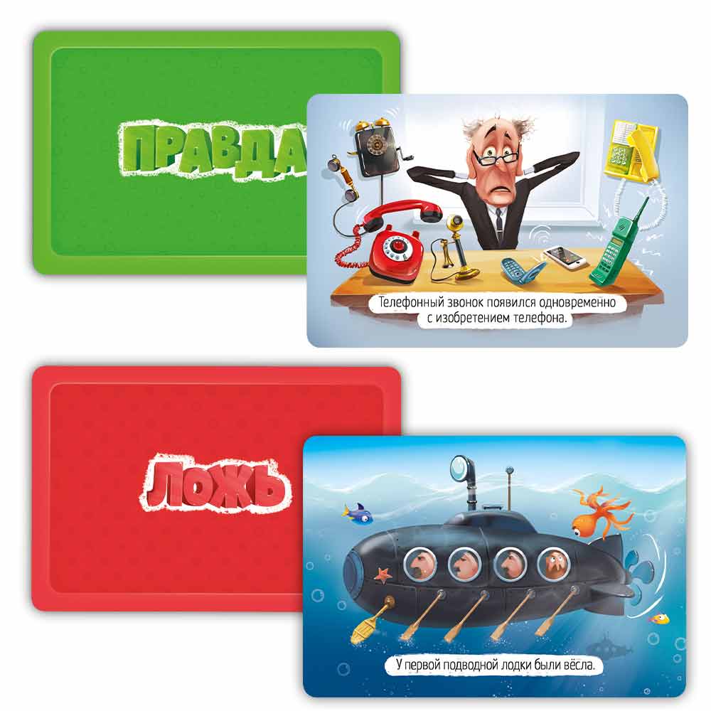 Эта карточная игра – находка для любознательных детей и их родителей! На карточках – 50 интересных фактов об открытиях, изобретениях и замечательные смешные иллюстрации. Сможете ли вы разобраться, где правда, а где ложь? Играйте – будет интересно!