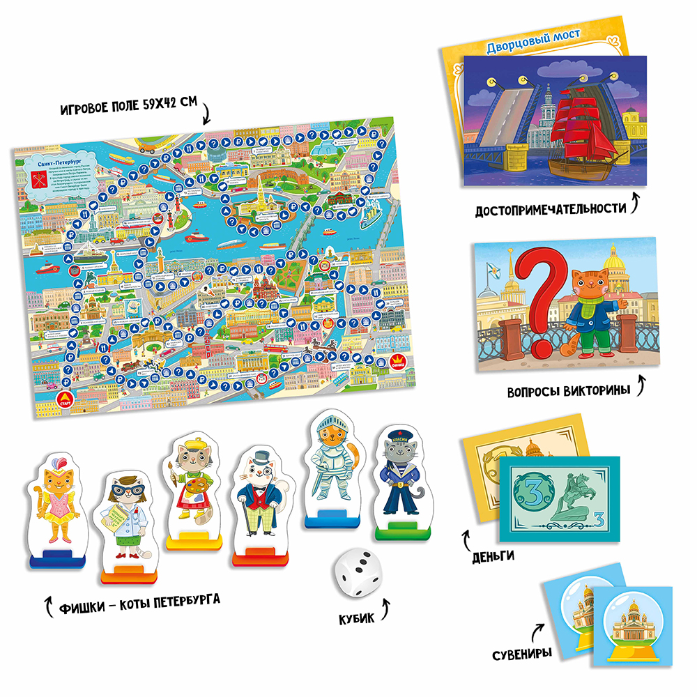 Добро пожаловать в Санкт-Петербург – город мостов и каналов! Вместе с пушистыми знатоками города – милыми котами и кошками – вам предстоит прогуляться по Северной столице! Правильные ответы на вопросы викторины помогут приобрести билеты в музеи и театры, а ваши провожатые – городские котики – с удовольствием покажут свои любимые места Петербурга. В этой игре победит не тот, кто быстрее окажется на финише, а тот, кто посетит больше интересных мест в прославленном городе на Неве.