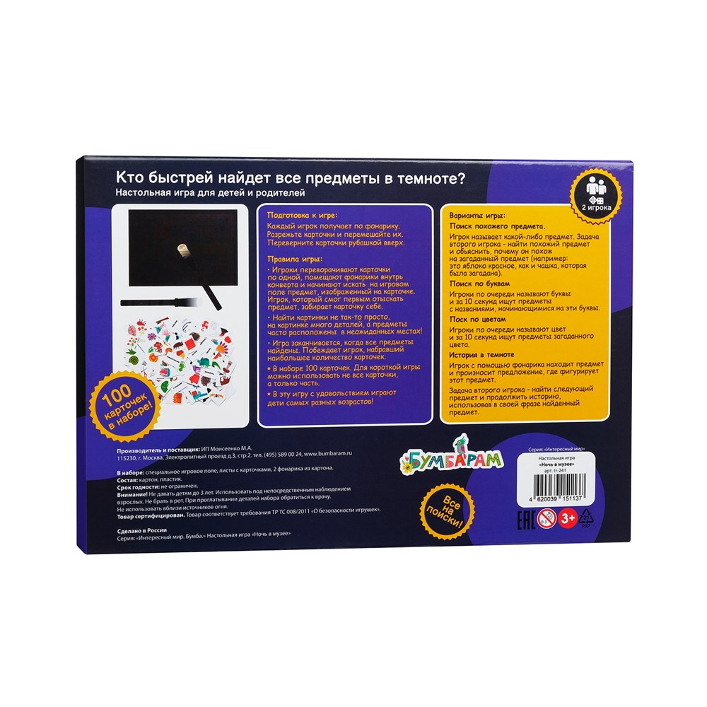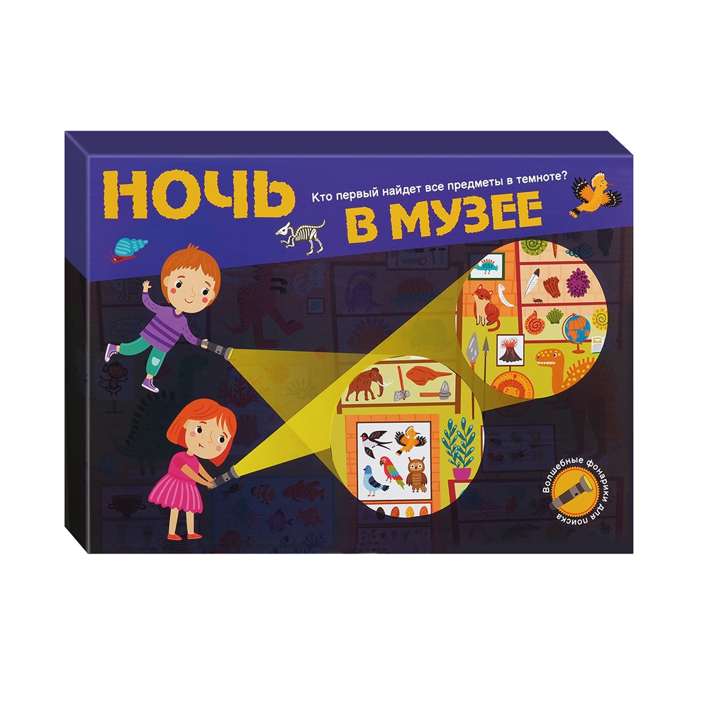 Ночь в музее — это увлекательная настольная игра для детей и родителей. В наборе вы найдете целых 100 карточек с предметами, специальное игровое поле и 2 фонарика из картона. Переворачивайте карточки, опередите соперника и с помощью фонариков ищите на игровом поле предметы, изображенные на карточке. Выигрывает тот, кто первым найдет все предметы в «темноте».