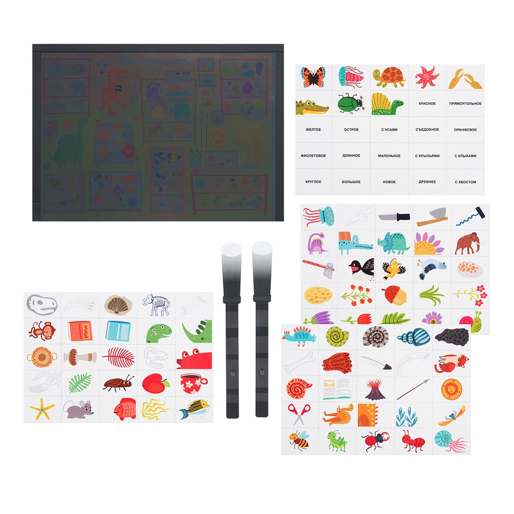 - В наборе: специальное игровое поле с эффектом «темноты», листы со 100 карточками, 2 фонарика из картона