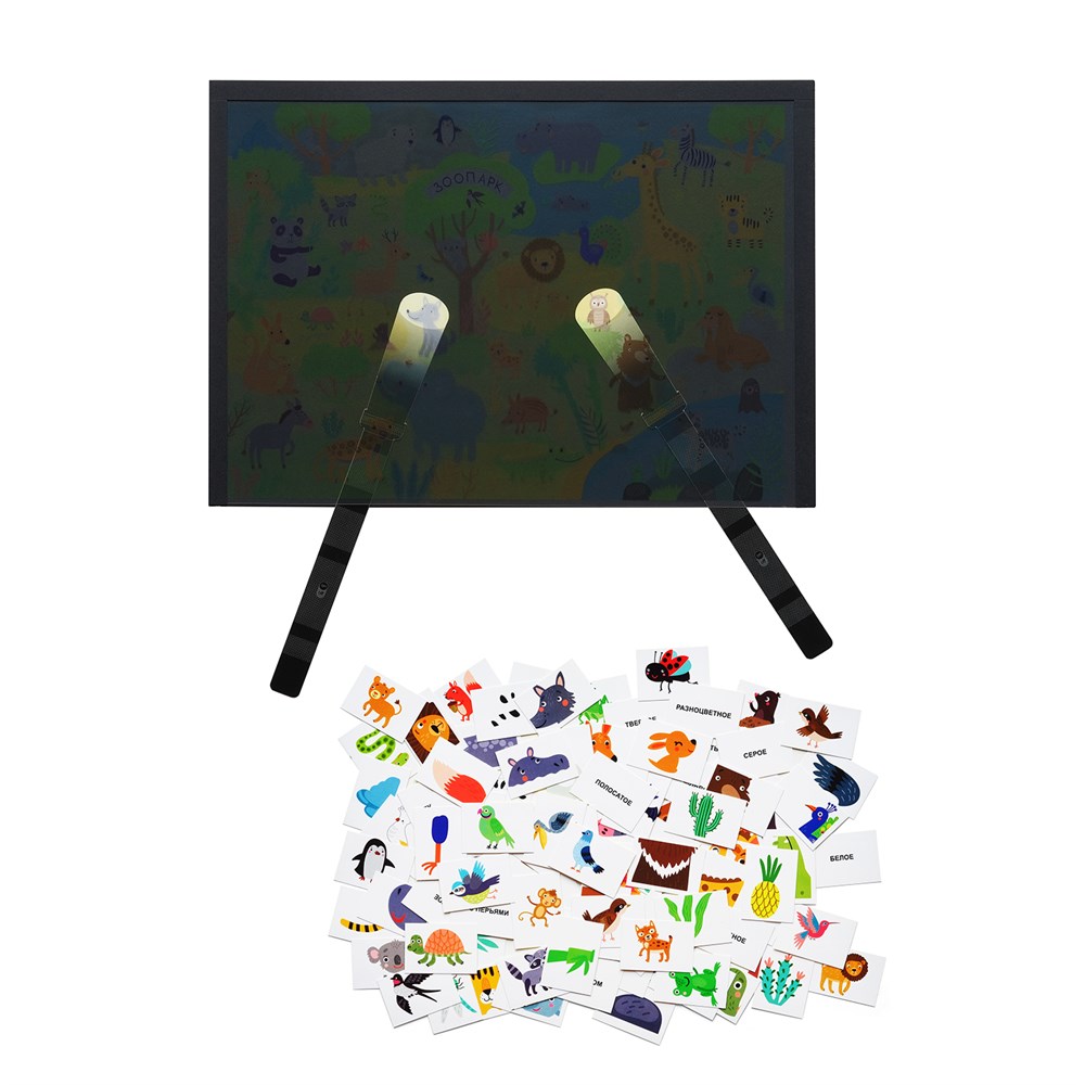 - В наборе: специальное игровое поле с эффектом «темноты», листы со 100 карточками, 2 фонарика из картона