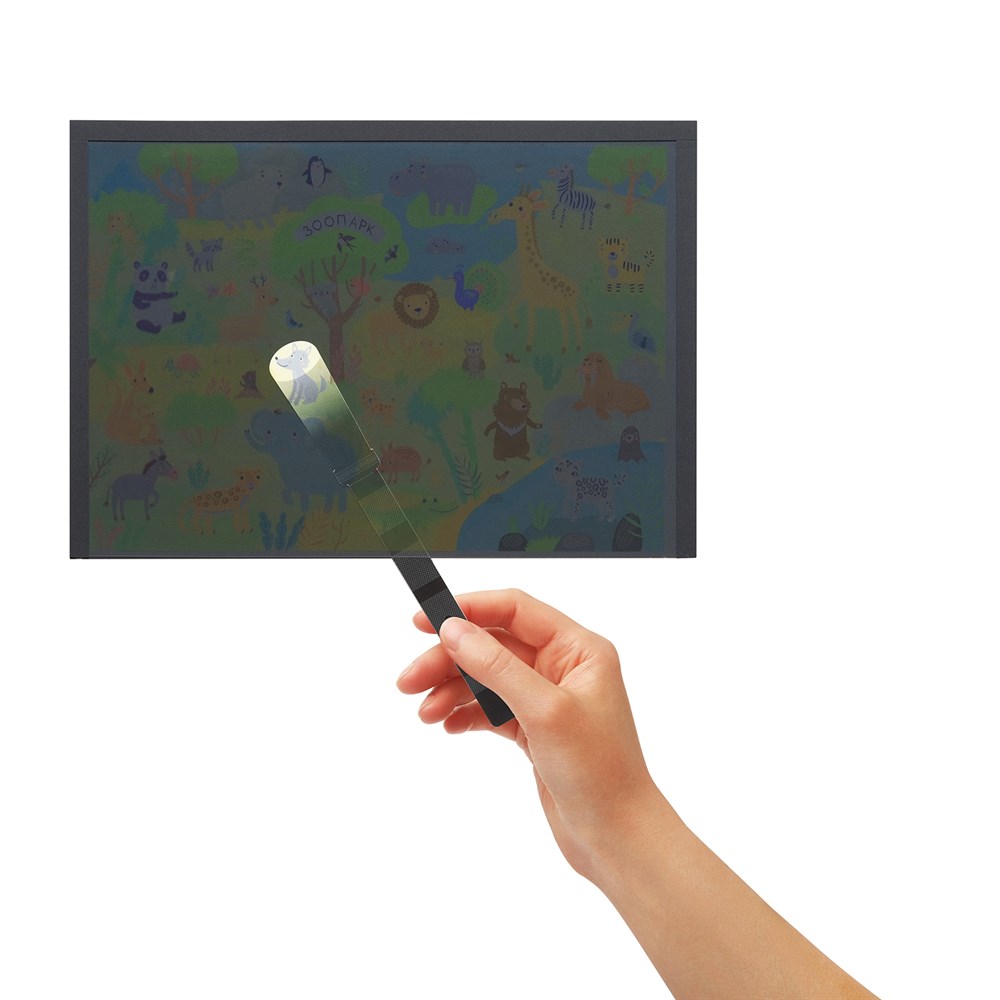 В наборе: специальное игровое поле с эффектом «темноты», листы со 100 карточками, 2 фонарика из картона
