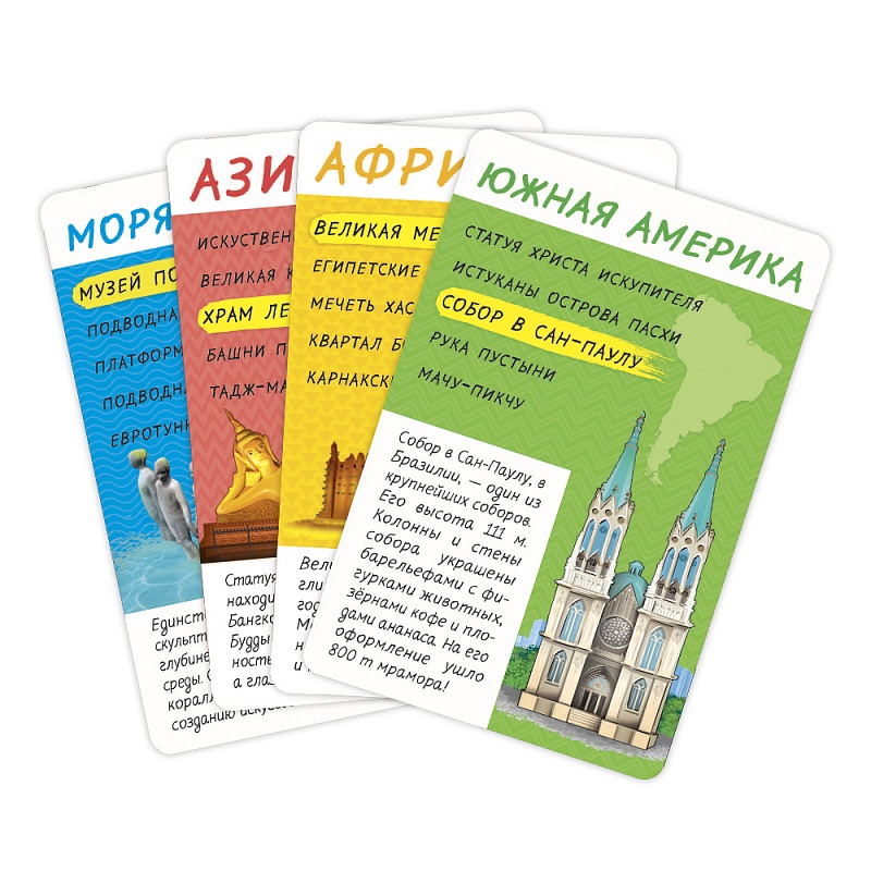 В этой коробке простая и увлекательная игра, которая учит мыслить логически и развивает память. В ходе игры содержимое карточек запоминается само собой. И теперь вы с лёгкостью скажете, где находится подводный музей, а где Римский Колизей!