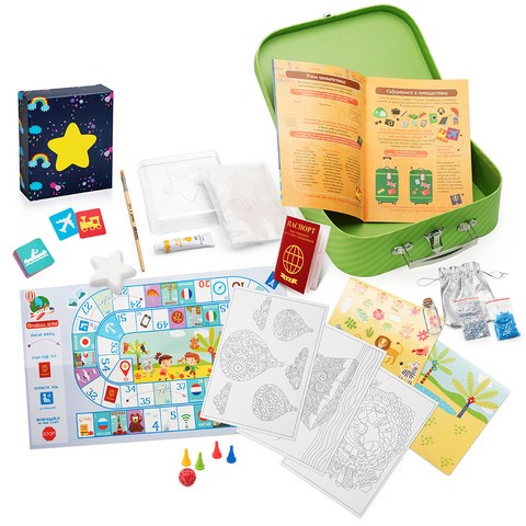 Внутри вы также найдете яркую книжку-инструкцию, с помощью которой можно устроить настоящее приключение, не выходя из дома. А в паспорт путешественника можно проставлять визы за каждое выполненное задание. Конечная цель – большая звезда путешественника! Подарочный набор содержит несколько вариантов развивающих игр для детей, материалы для творческих поделок, наклейки для украшения чемоданчика и многое другое.