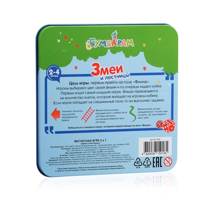 - В комплекте: коробка с магнитным полем, магнитные фишки, игральный кубик