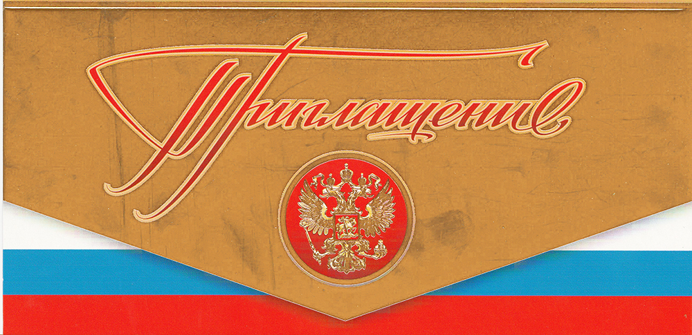 Бланк приглашения складывается пополам по вертикали и имеет горизонтальное расположение. Внешний блок содержит иллюстрации с российской символикой и тиснение золотой фольгой, внутренний - без линовки, офсет, белая бумага.