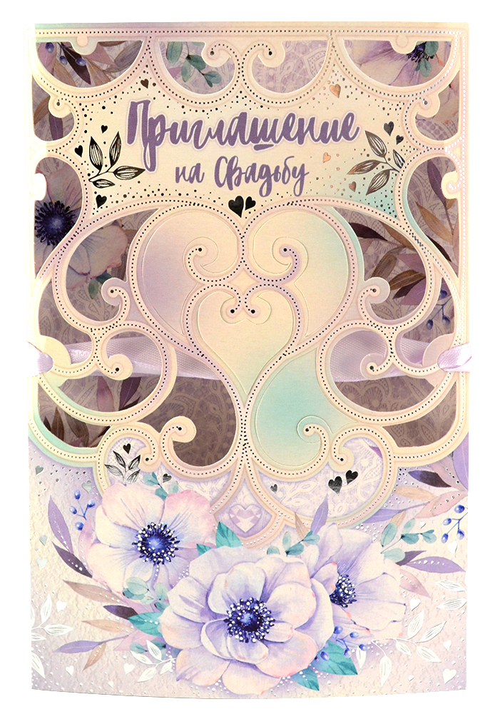 Бланк приглашения складывается с двух сторон и завязывается лентами, имеет вертикальное расположение. Внешний блок содержит иллюстрации оригинального дизайна и фигурную вырубку, внутренний - разлиновку для текста.