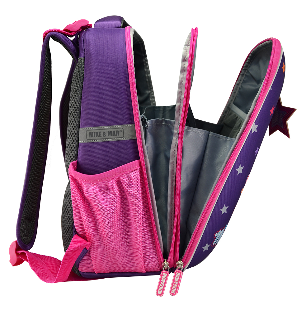 Данный ранец содержит большое отделения на молнии,поделенное на три равных части, объемный карман на лицевой стороне рюкзака и два сетчетых боковых кармана с резинкой.